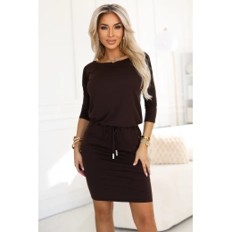 Sportowa sukienka marki Numoco w kolorze czekoladowego brązu. Wykonana z miękkiej, elastycznej dzianiny, posiada rękaw 3/4, kieszenie i wiązanie w pasie, które podkreśla talię. Stylowa, wygodna i idealna na co dzień. Produkt polski.