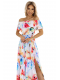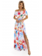 Długa sukienka hiszpanka z rozcięciem na nodze i paskiem. Wzór w malowane kwiaty ?