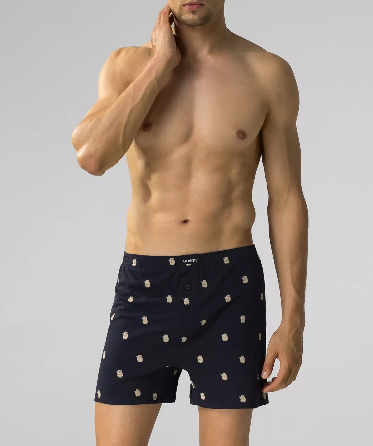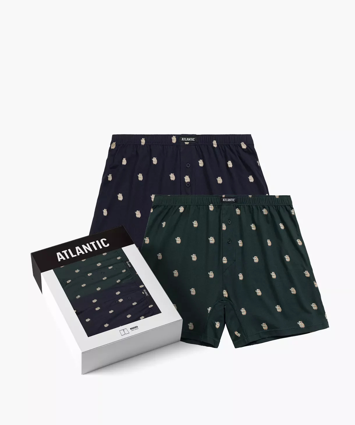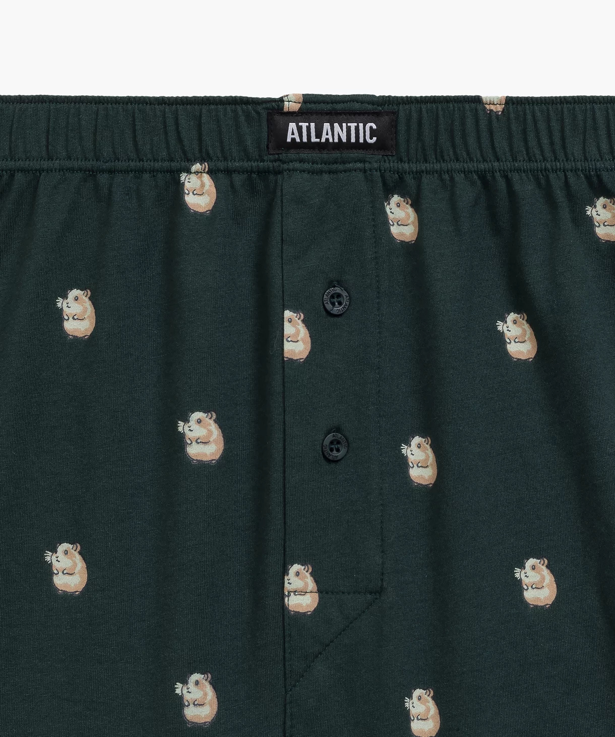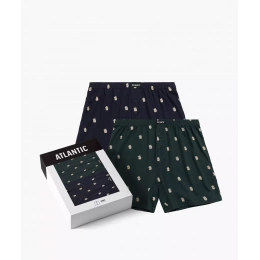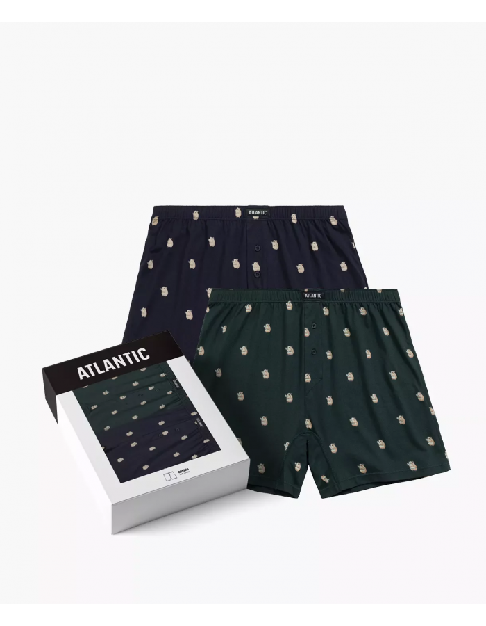 Luźne bokserki męskie w kolorze granatowym i szmaragdowym, ozdobione są niewielkich rozmiarów, zabawnymi chomikami. Bokserki idealne do noszenia na co dzień mają średniej wysokości talię zaznaczoną nieuciskającą ciała gumą i logo Atlantic, standardowej długości nogawki oraz dwa guziczki z przodu.