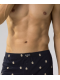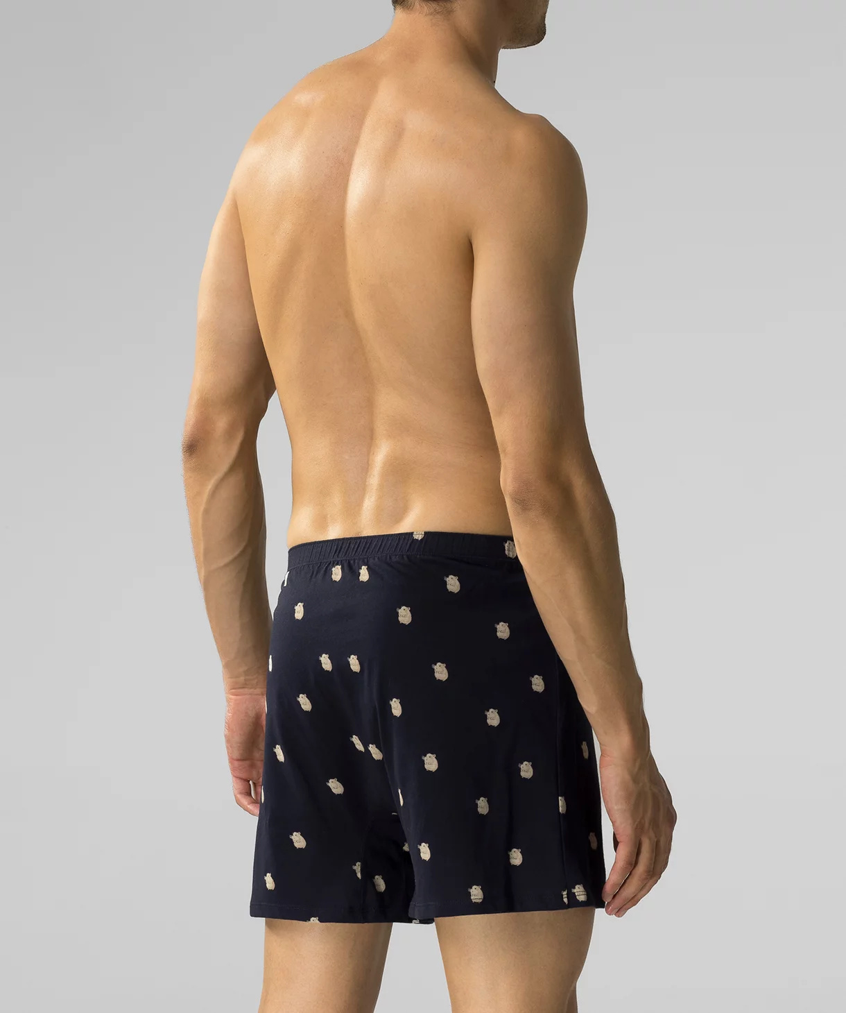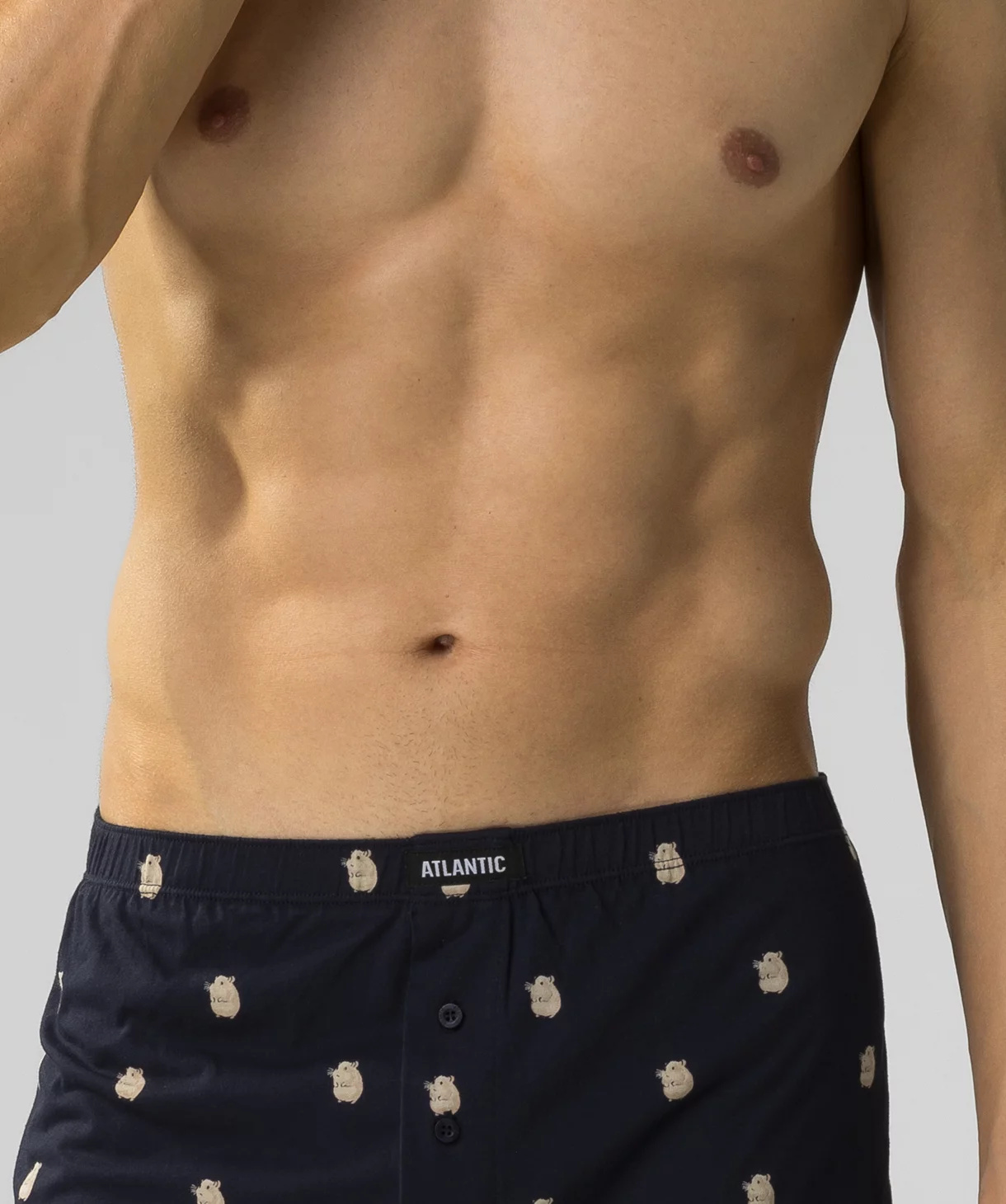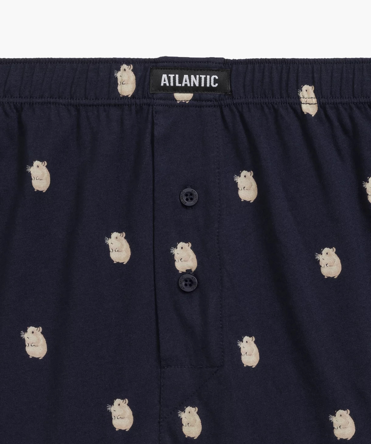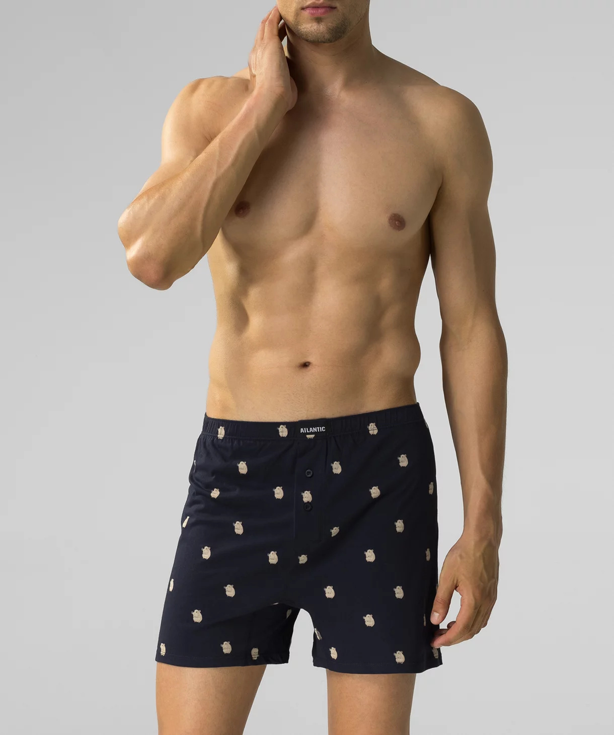 Luźne bokserki męskie w kolorze granatowym i szmaragdowym, ozdobione są niewielkich rozmiarów, zabawnymi chomikami. Bokserki idealne do noszenia na co dzień mają średniej wysokości talię zaznaczoną nieuciskającą ciała gumą i logo Atlantic, standardowej długości nogawki oraz dwa guziczki z przodu.