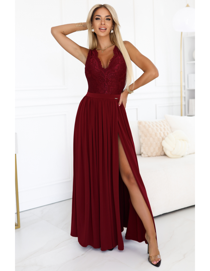 LEA – długa bordowa suknia wieczorowa marki Numoco z koronkową górą, odkrytymi plecami i wysokim rozcięciem na nodze. Idealna na wesela, bale i eleganckie uroczystości.