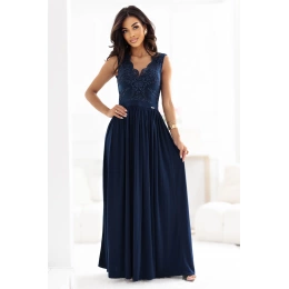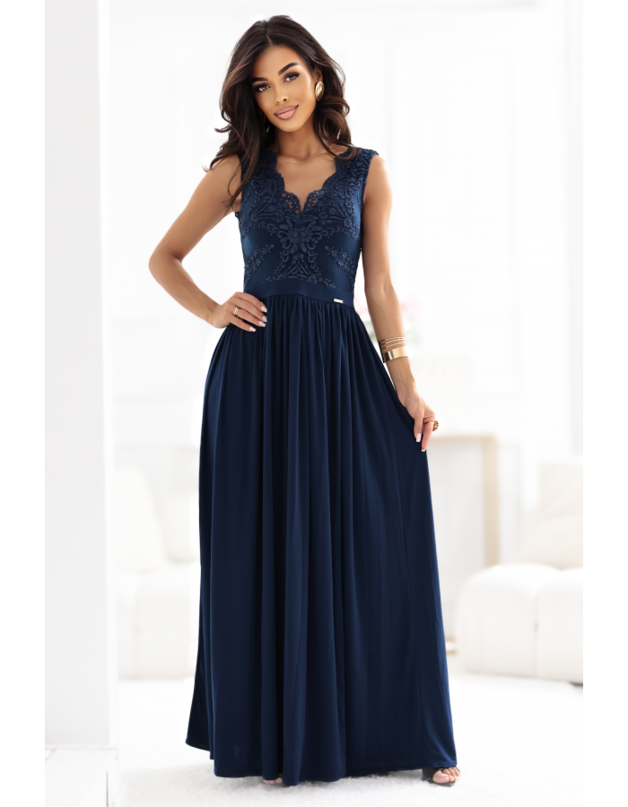 Elegancka granatowa sukienka maxi LEA z koronkową górą i rozcięciem na nodze to propozycja, która łączy szyk i nowoczesny styl. Polska produkcja marki Numoco gwarantuje wysoką jakość i doskonałe dopasowanie, a kreacja sprawdzi się na wesele, bal czy studniówkę.