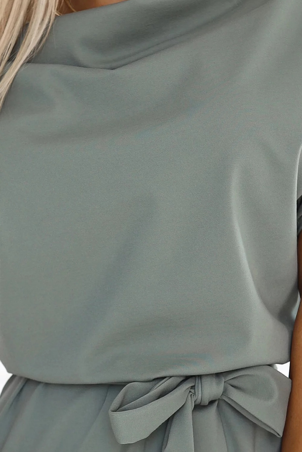Roxi – stylowa sukienka marki Numoco o wyjątkowym kroju, który łączy elegancję z komfortem. Model posiada asymetryczną spódnicę, podkreśloną paskiem, oraz dekolt typu "woda", nadający kreacji subtelnego uroku. Wykonana z elastycznej dzianiny w modnym oliwkowym kolorze, doskonale dopasowuje się do sylwetki. Produkt polski, idealny na różne okazje, łączący nowoczesny design z wysoką jakością wykonania.