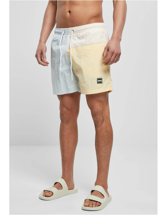 Tyto pánské koupací šortky s asymetrickým barevným blokem jsou na léto. Elastický pas se stahovacími šňůrkami a pravidelný střih zajišťují dokonalé uchycení, zatímco dvě boční kapsy a zadní kapsa nabízejí praktické úložné prostory. Plavky jsou vyrobeny z nylonu a podšité šířkou polyesterové síťoviny. Styl završuje jemná nášivka Urban Classics na levém stehně.