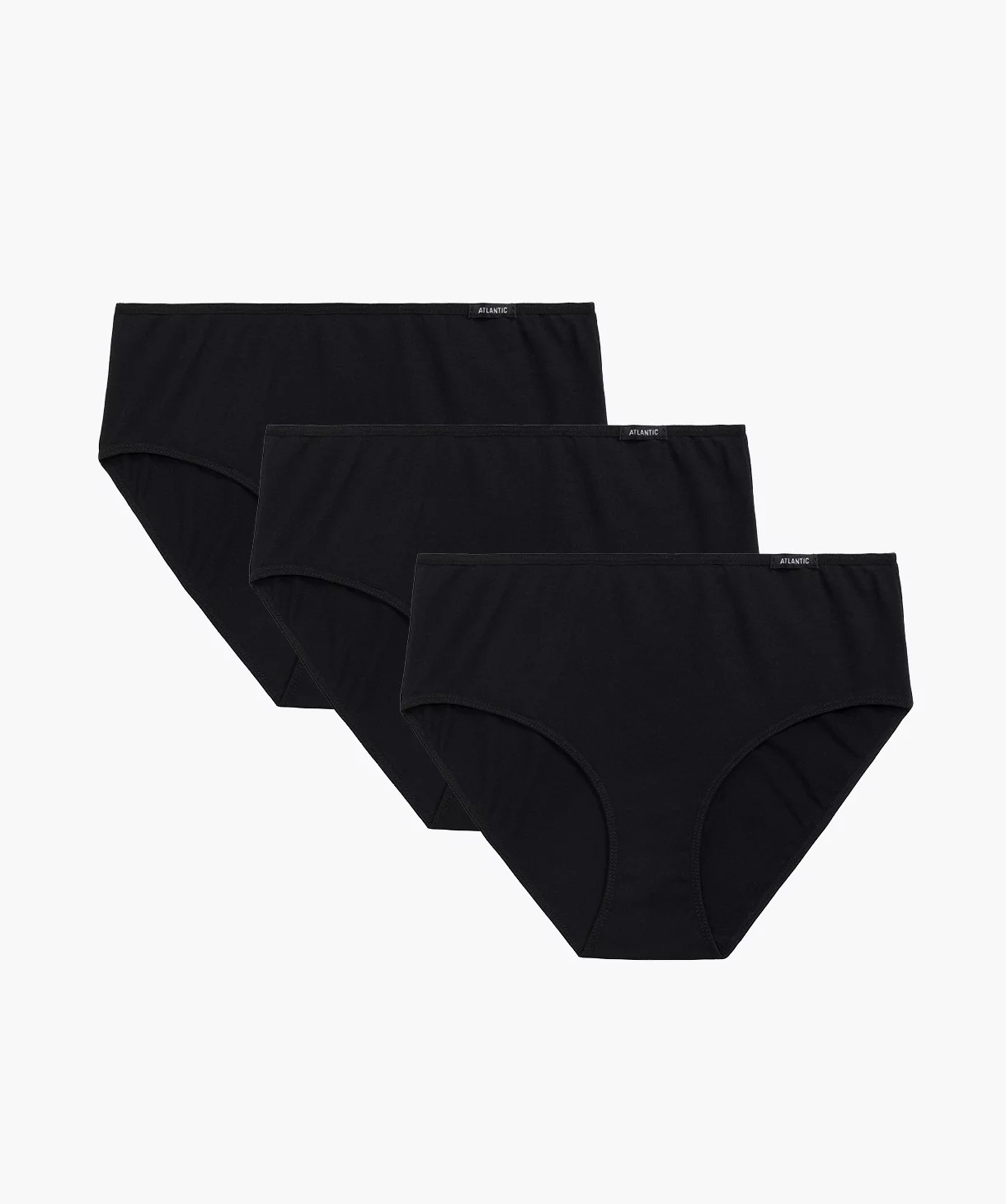 Poznaj majtki damskie o najbardziej uniwersalnym charakterze, jaki możesz sobie wyobrazić. Majtki w kolorze czarnym są szerokie po bokach i mają wysoko zachodzący na brzuch stan. W talii wykończone są miękką i nieuciskającą ciała gumą ozdobioną z boku logo Atlantic.