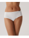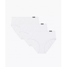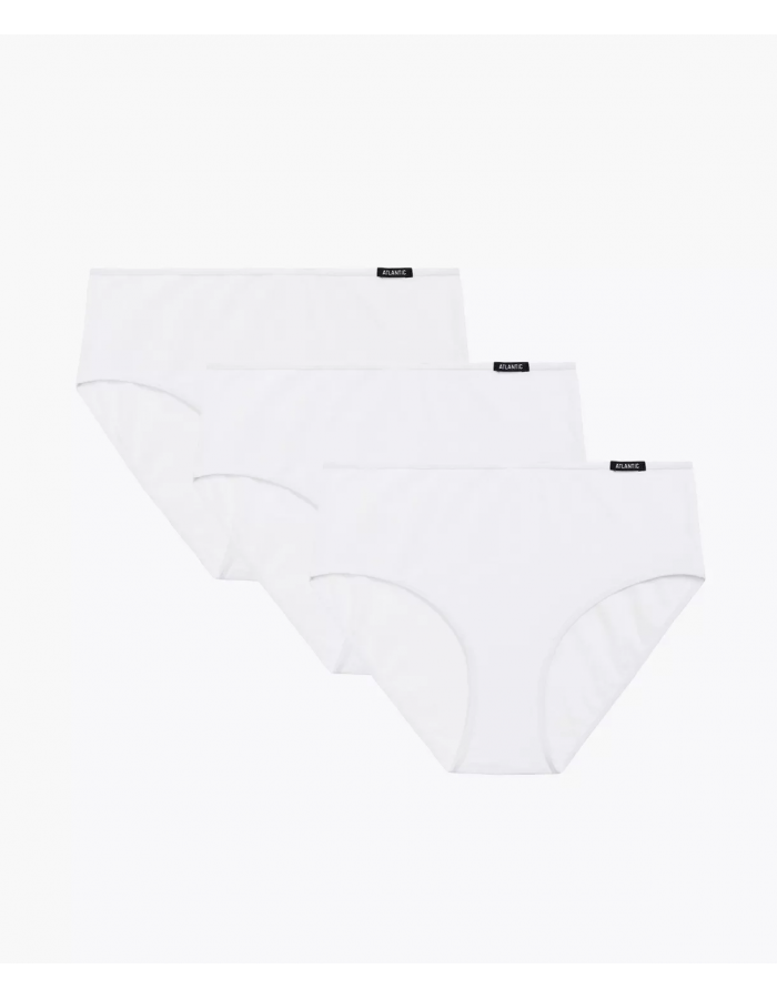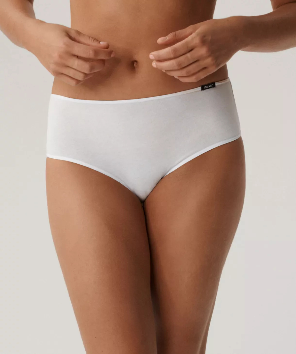 W trzypaku znajdziesz białe majtki damskie o klasycznym charakterze. Majtki są dość mocno zabudowane - mają szerokie boki oraz wysoko zaznaczoną talię, która wykończona jest miękką i nieuciskającą ciała gumą ozdobioną z boku logo Atlantic.