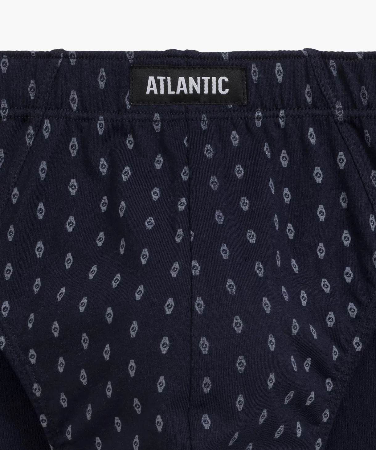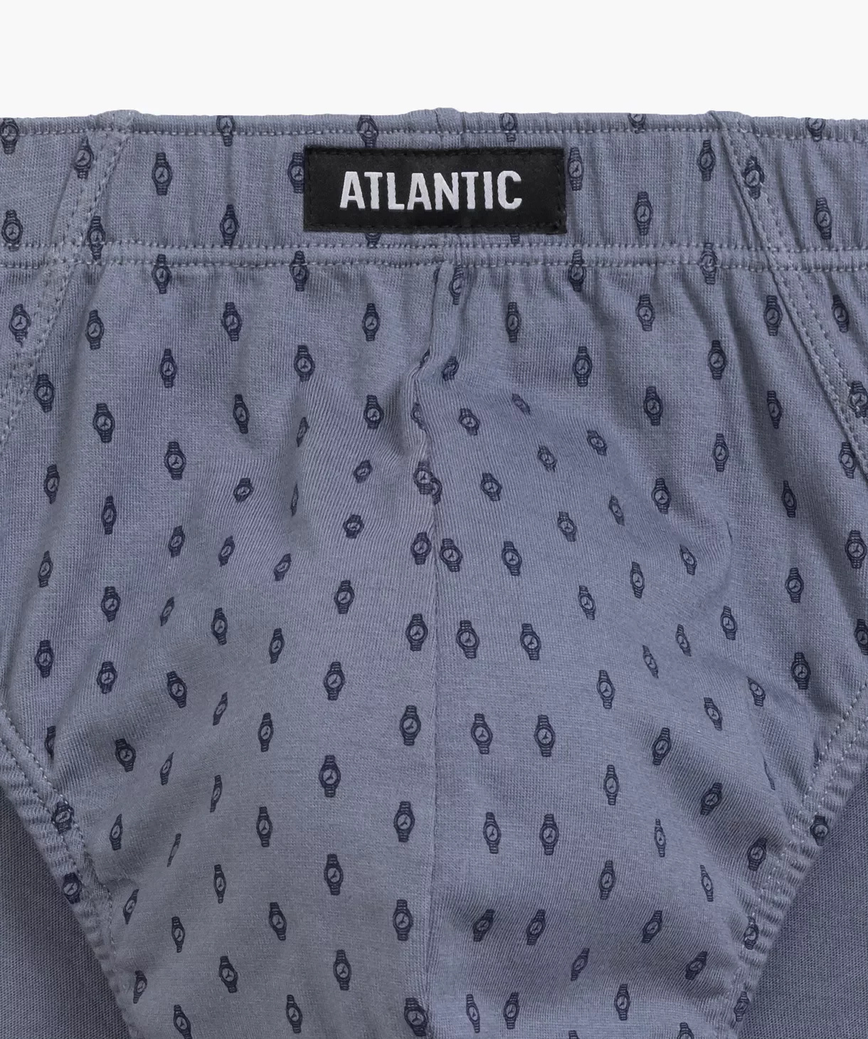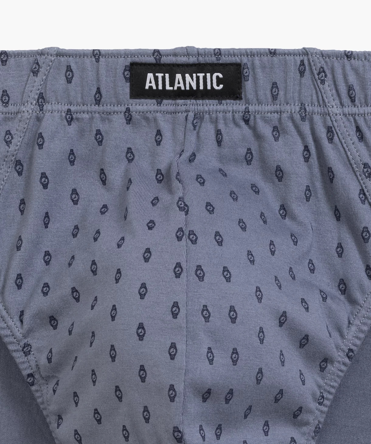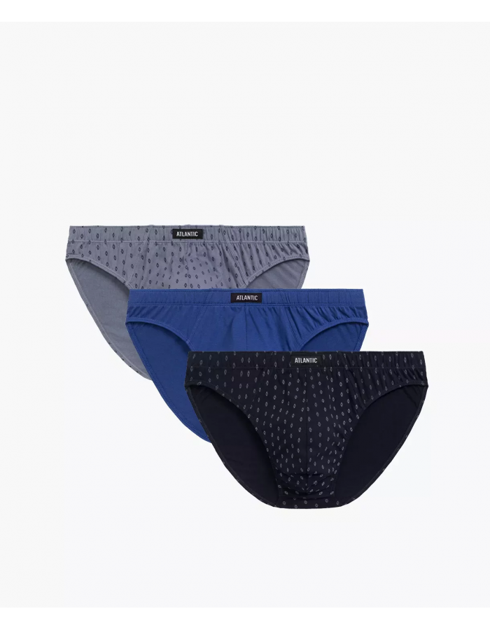 W 3-packu znajdziesz granatowe i szare slipy męskie ozdobione maleńkimi wzorkami w zegarki oraz jedną parę gładkich majtek w kolorze ciemno-niebieskim. Slipy odznaczają się sportowym krojem co oznacza, że mają niską talię, w której zaznaczone są miękką i nieuciskającą ciała gumą ozdobioną logo Atlantic oraz dość mocno podcięte boki, tym samym eksponują i wydłużają nogi.