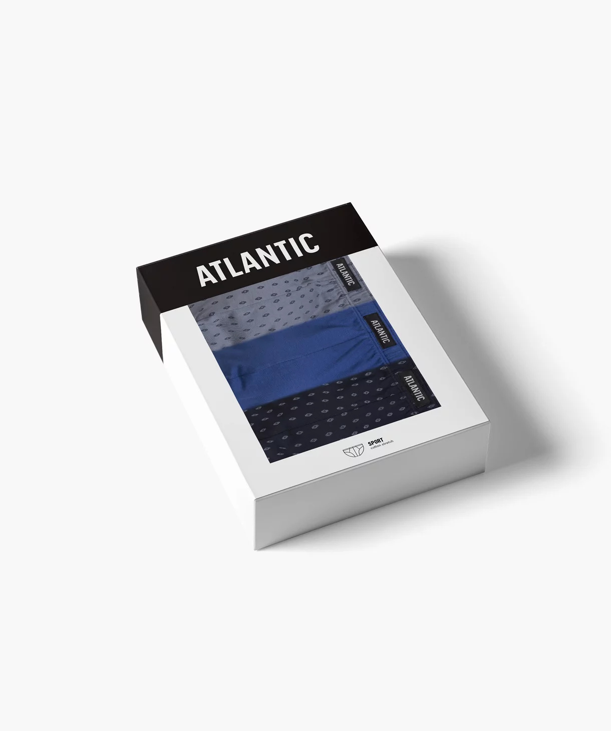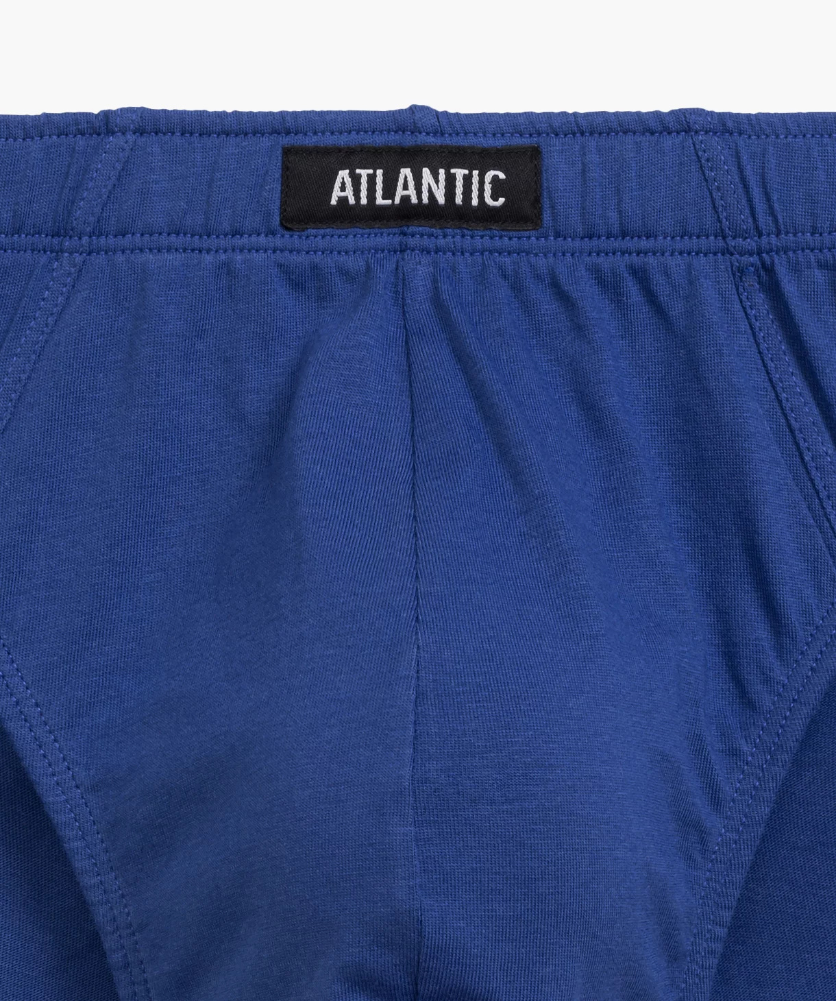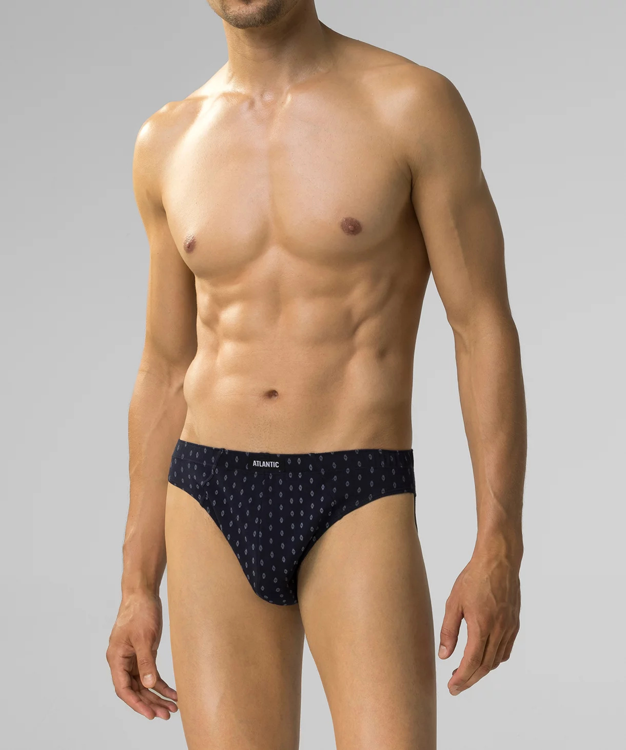 W 3-packu znajdziesz granatowe i szare slipy męskie ozdobione maleńkimi wzorkami w zegarki oraz jedną parę gładkich majtek w kolorze ciemno-niebieskim. Slipy odznaczają się sportowym krojem co oznacza, że mają niską talię, w której zaznaczone są miękką i nieuciskającą ciała gumą ozdobioną logo Atlantic oraz dość mocno podcięte boki, tym samym eksponują i wydłużają nogi.