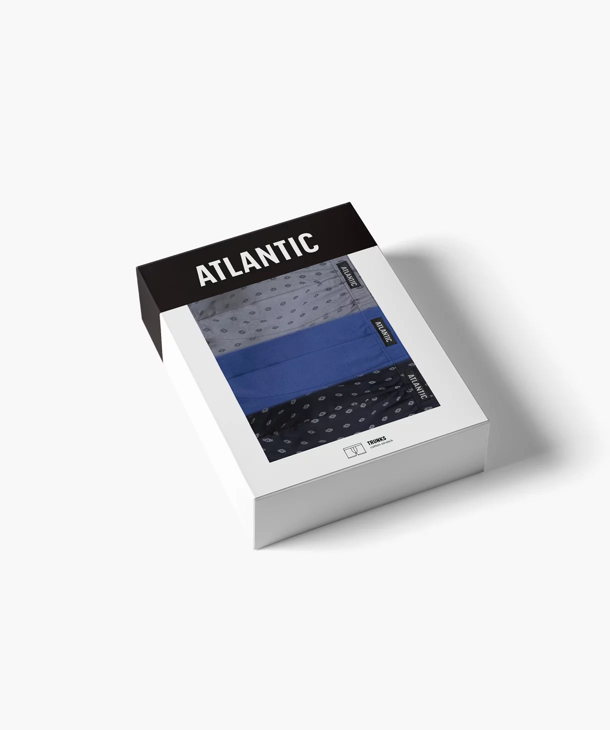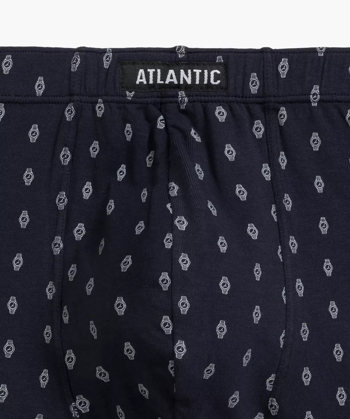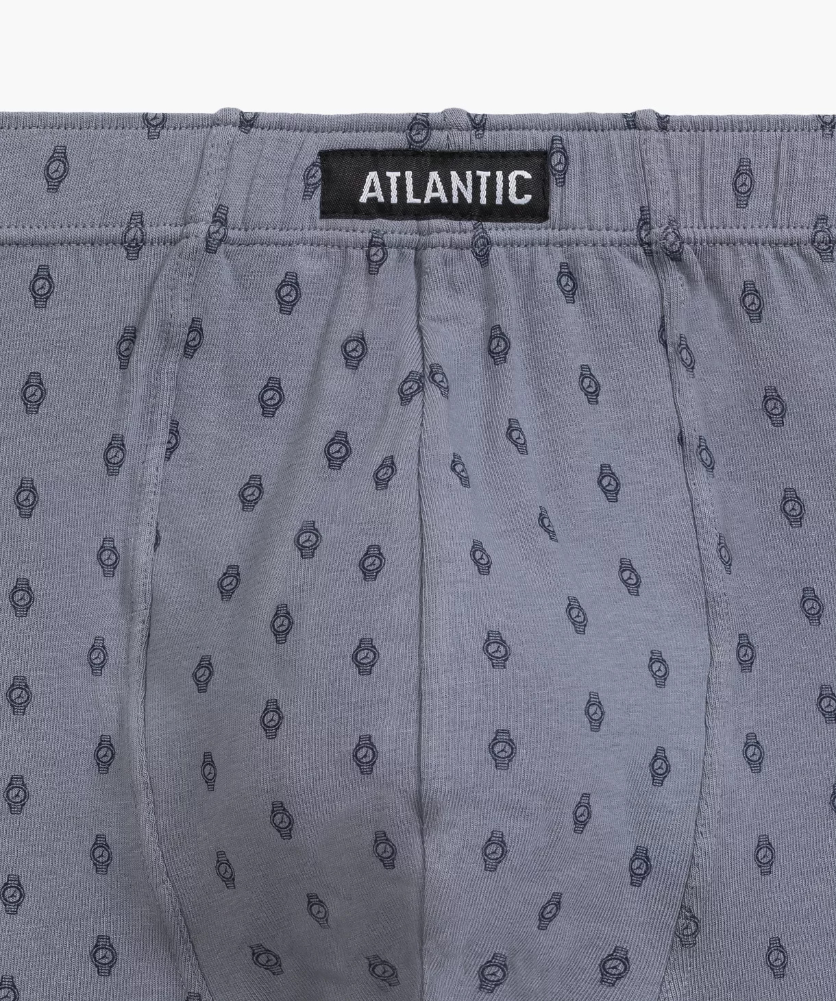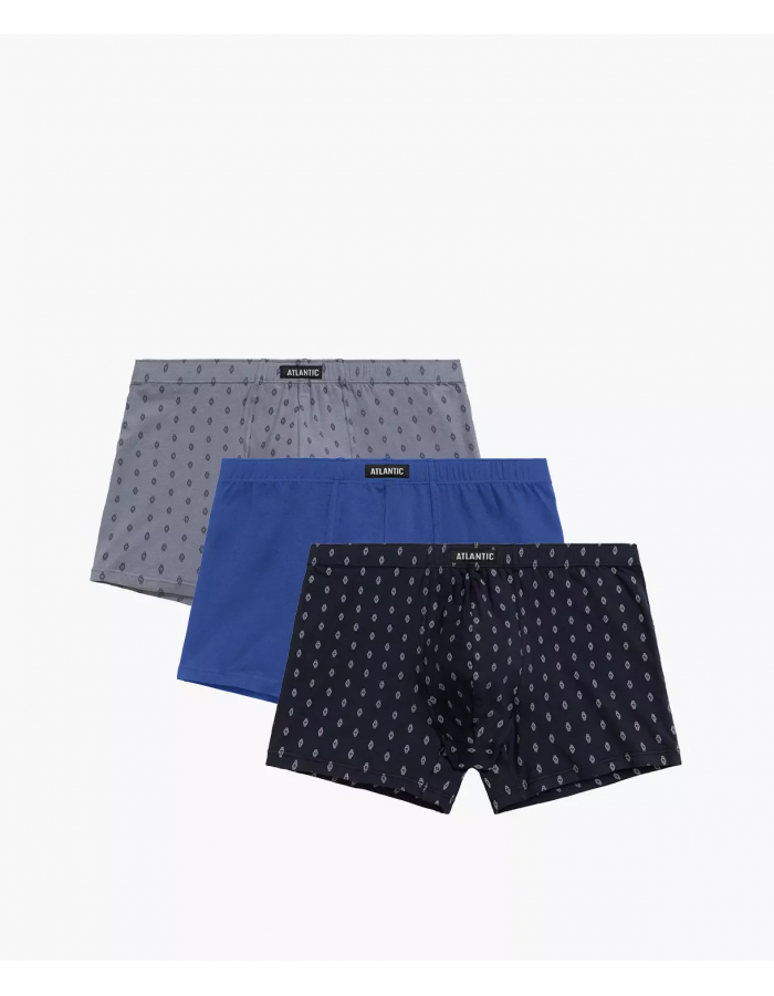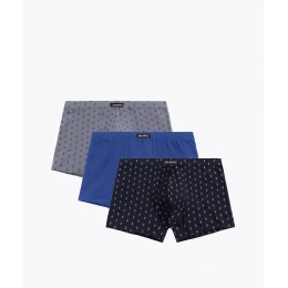 W 3-packu znajdziesz granatowe i szare bokserki męskie ozdobione maleńkich rozmiarów wzorkami w zegarki oraz ciemno-niebieskie, gładkie. Sportowe bokserki mają niską talię, w której zaznaczone są miękką i nieuciskającą gumą wewnętrzną oraz standardowej długości nogawki.