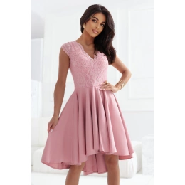 Elegancka różowa sukienka z koronkową górą i rozkloszowanym, asymetrycznym dołem. Idealna na wesele, przyjęcie lub romantyczną randkę. Produkt polski marki Numoco.