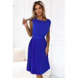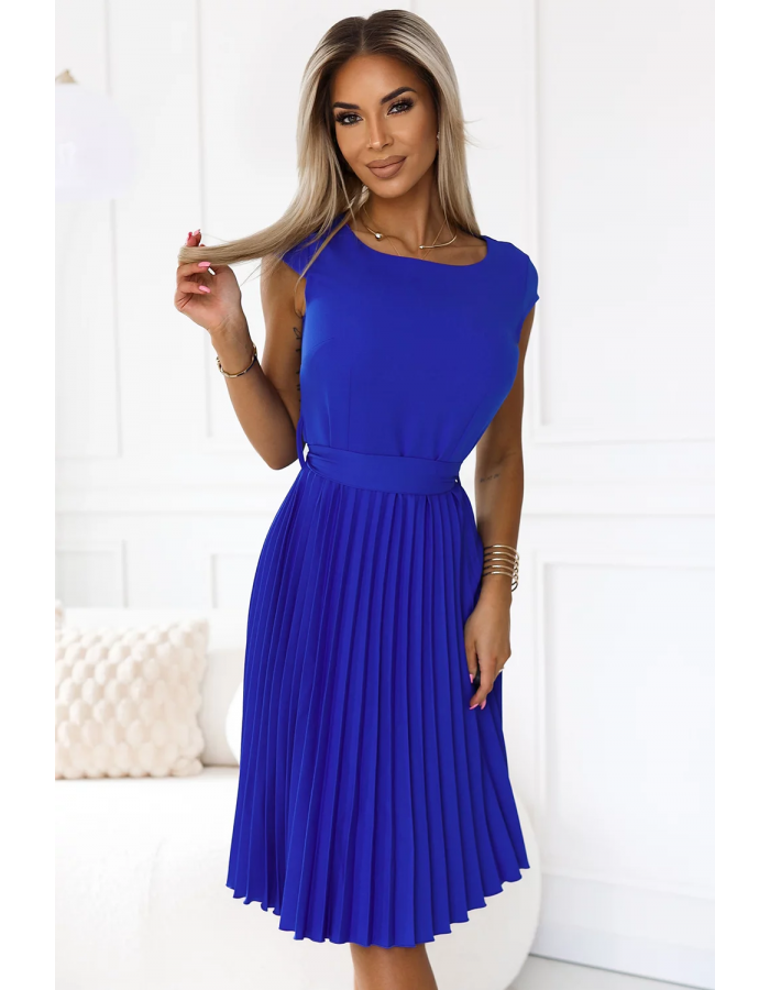 Numoco jsou elegantní plisovaná kreace v chrpové barvě. Má krátké rukávy a pásek v pase, který zdůrazňuje postavu a dodává jí jemný půvab. Zapínaná vzadu na skrytý zip, zajišťuje pohodlí a ideální přizpůsobení. Je to polský produkt, který spojuje klasický styl s moderním provedením. Ideální pro různé příležitosti.