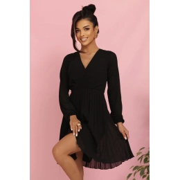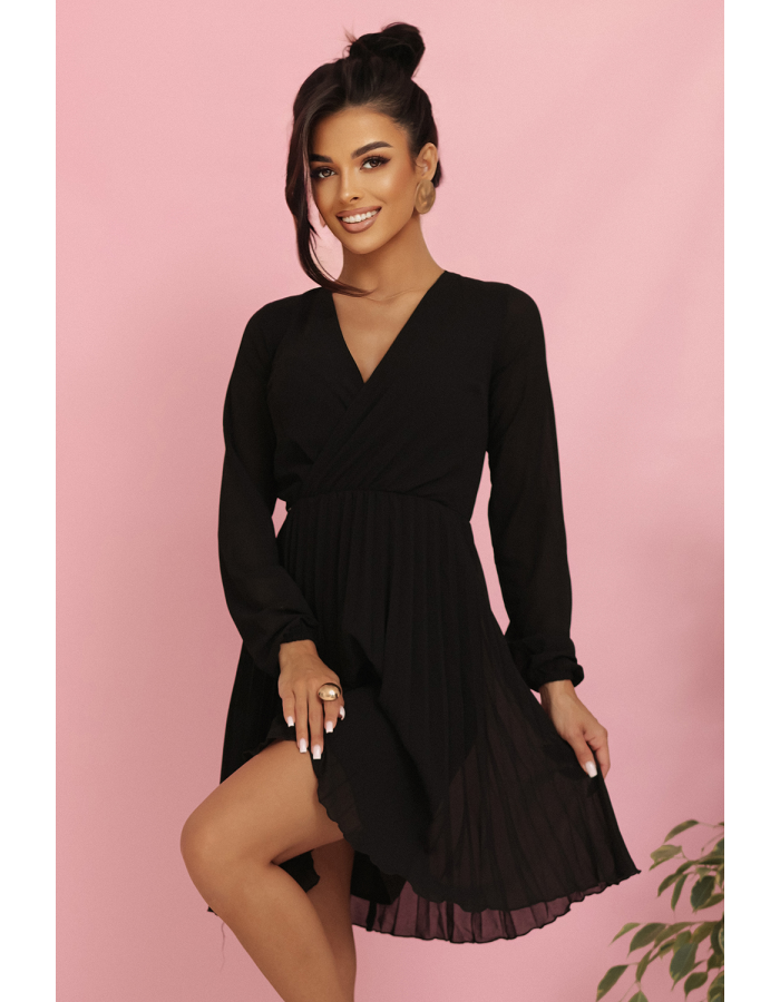 Elegancka czarna sukienka z szyfonu z kopertowym dekoltem i plisowanym dołem. Marka Numoco, produkcja polska. Idealna na wieczorne wyjścia i specjalne okazje.