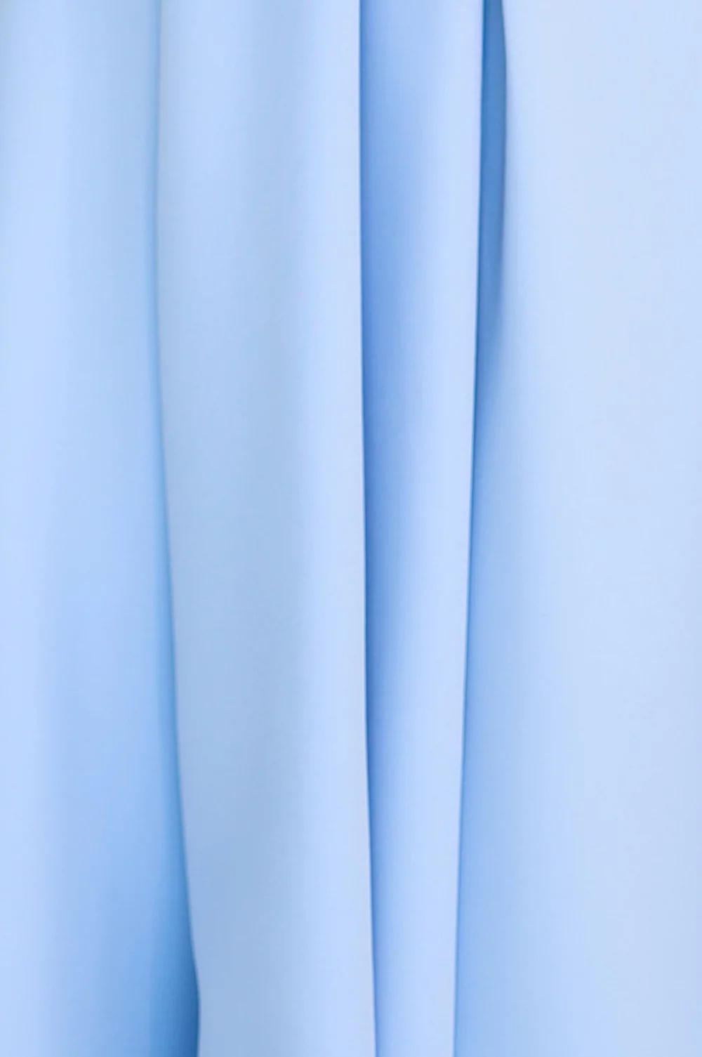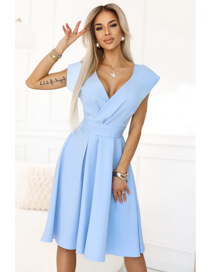 Błękitna rozkloszowana sukienka z dekoltem i paskiem podkreślającym talię. Elegancka i kobieca propozycja na każdą okazję.