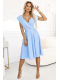 Světle modré rozšířené šaty s výstřihem a páskem zdůrazňujícím pas. Elegantní a ženský návrh pro každou příležitost.