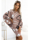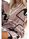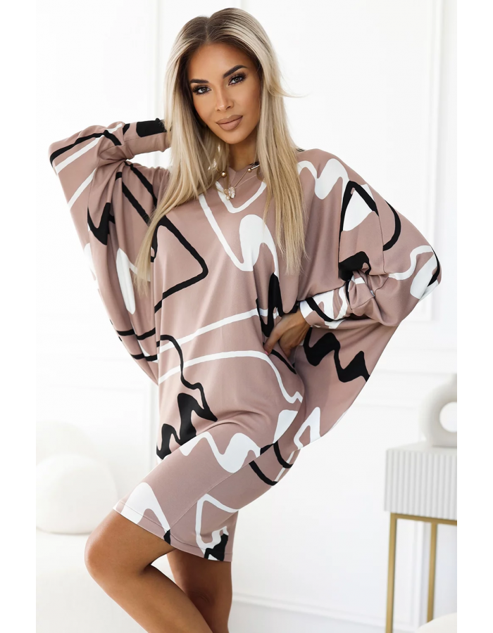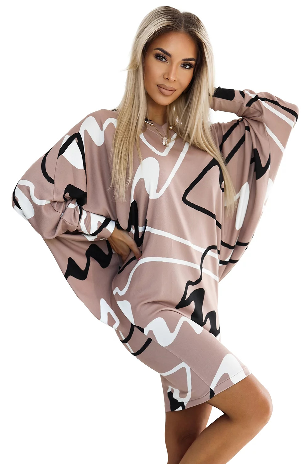 Svetrové šaty netopýr - béžové s černo-bílým vzorem