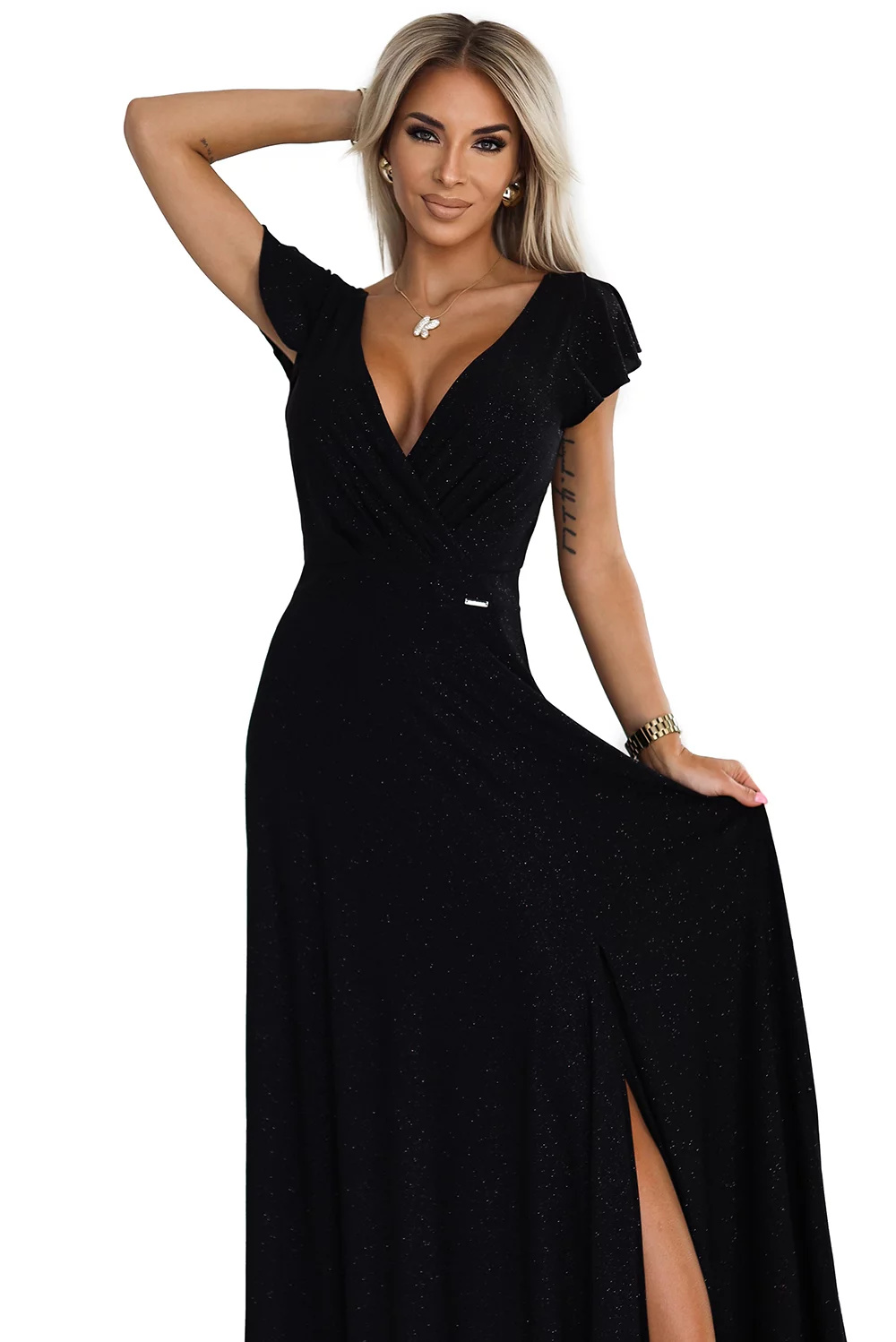 Dlouhé třpytivé šaty s výstřihem - černé s třpytkami