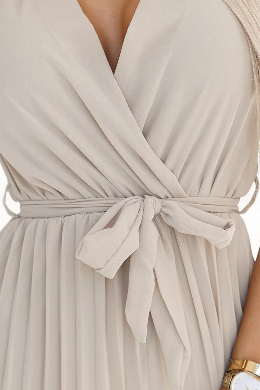 Plisowana szyfonowa sukienka z dekoltem - beżowa