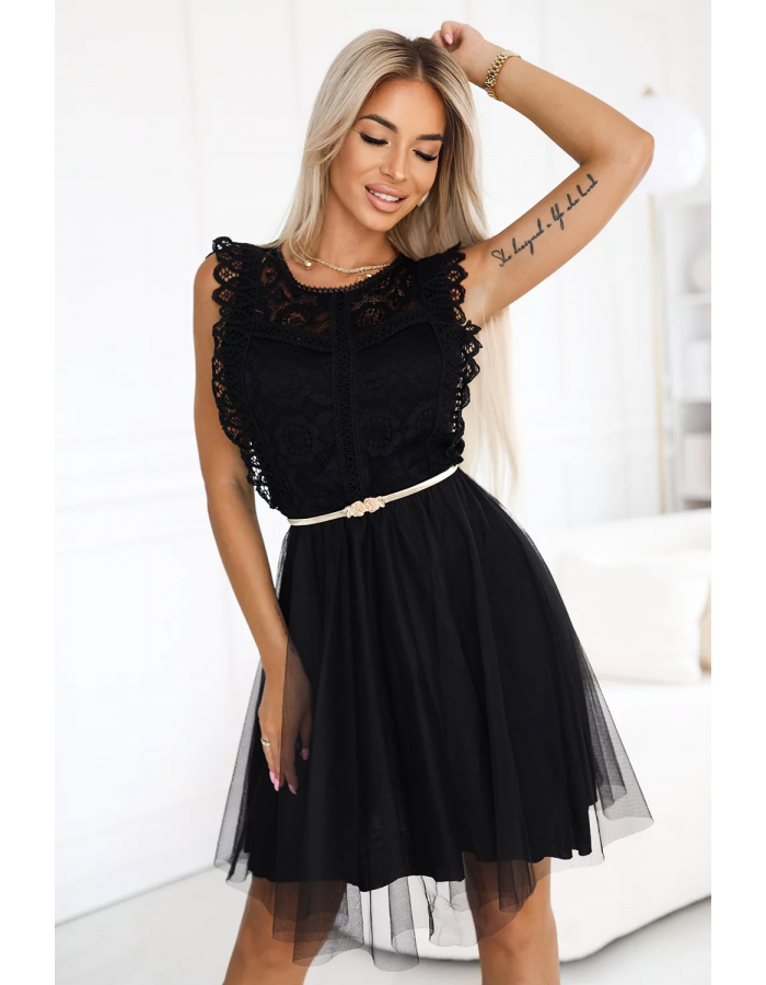 Koronkowa czarna sukienka z tiulowym dołem i paskiem | Numoco Basic