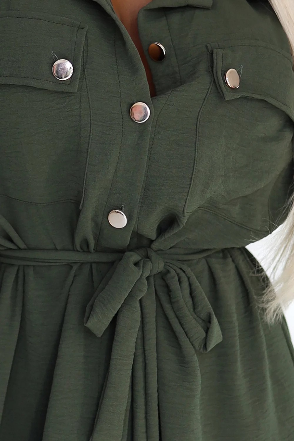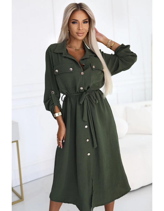 Stylowa szmizjerka w kolorze khaki z paskiem, zapinana na guziki. Idealna na co dzień, do pracy i na spotkania. Marka Numoco Basic, produkcja europejska.