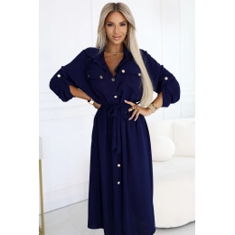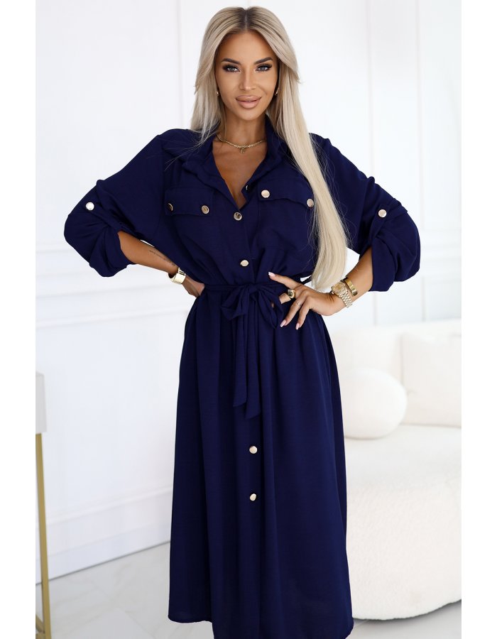 Tmavě modrá košilová šaty s páskem a zlatými knoflíky. Stylové košilové šaty značky Numoco Basic – ideální na každý den i do práce. Evropská produkce.