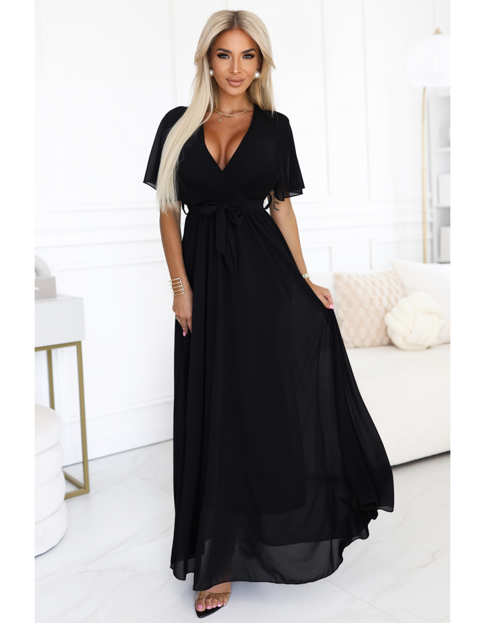 Czarna długa sukienka z plisowanym dekoltem – Numoco Basic