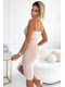sukienka midi o dopasowanym kroju, podkreślająca kobiece kształty. Sukienka posiada kopertowy dekolt na cienkich, regulowanych ramiączkach, który eksponuje linię szyi i dekoltu. W talii zastosowano subtelne przeszycia, które optycznie wysmuklają sylwetkę. Sukienka ma długość przed kolano oraz delikatne rozcięcie z boku, dodające szyku i zmysłowości. Wykonana z gładkiego materiału w kolorze beżu, który pięknie dopasowuje się do ciała. Idealna na wieczorne wyjścia, randki, wesela, komunie lub eleganckie przyjęcia. Produkcja