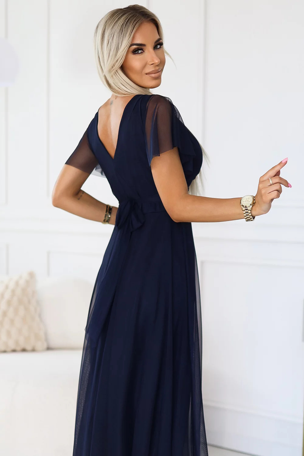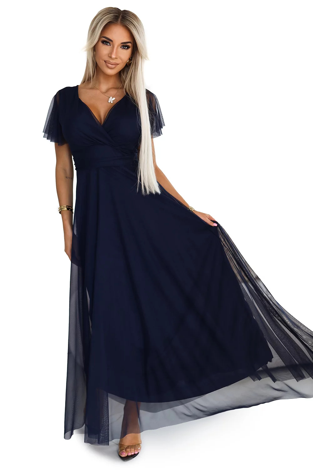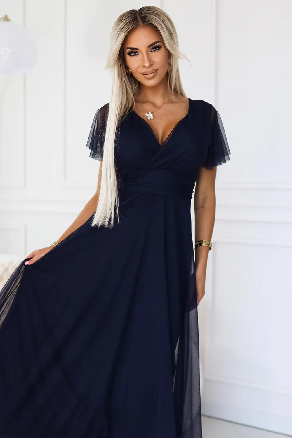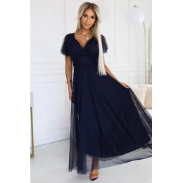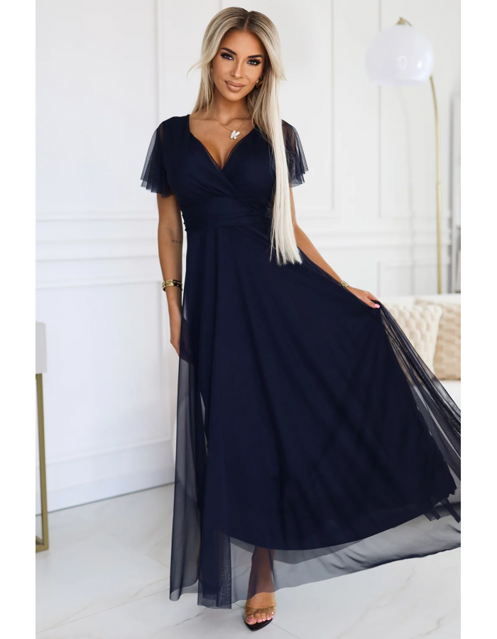 tmavomodrého tylu, který jí dodává vzdušnost a lehkost. Šaty mají vyztužené košíčky, což zajišťuje vynikající oporu, a zavazování v pase jemně zvýrazňuje pas. To je výjimečná nabídka s ženským a romantickým charakterem. Vyrobená v Evropě, spojuje vysokou kvalitu zpracování a elegantní design. Ideální na večerní výlety a speciální události.