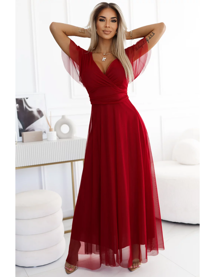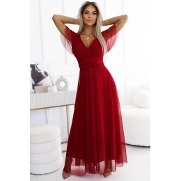 bordového tylu, který jí dodává vzdušnost a lehkost. Šaty mají vyztužené košíčky, což zajišťuje vynikající oporu, a zavazování v pase jemně zvýrazňuje pas. To je výjimečná nabídka s ženským a romantickým charakterem. Vyrobená v Evropě, spojuje vysokou kvalitu zpracování a elegantní design. Ideální na večerní výlety a speciální události.
