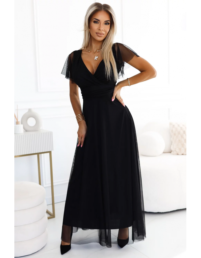 Dlouhé vzdušné šaty s výstřihem - černé