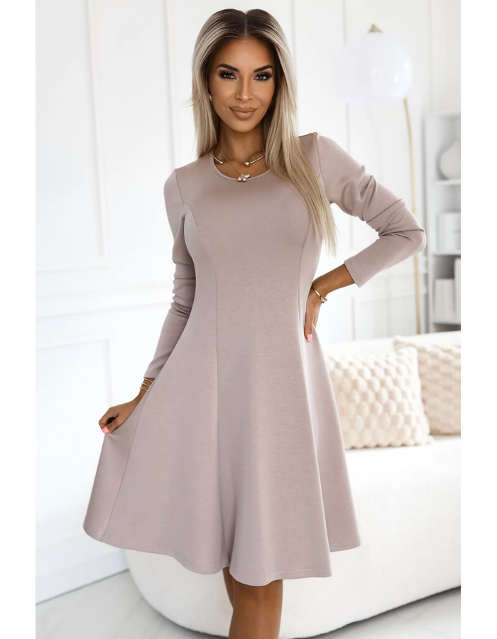 Numoco jsou pohodlnou a stylovou volbou na každý den. Šaty mají délku nad kolena a dlouhé rukávy, jejich střih zajišťuje volnost pohybu. Vyrobena z elastického, silnějšího béžového materiálu, skvěle se hodí do chladnějších dnů. Jedná se o