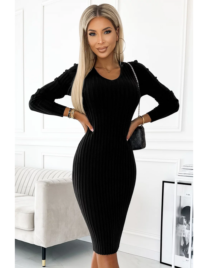 Svetrové šaty značky Numoco Basic jsou pohodlnou volbou na chladnější dny, s dlouhým rukávem a výstřihem do V. Ušitá z teplého, elastického černého materiálu v proužcích, dokonale se přizpůsobuje postavě a zároveň zajišťuje pohodlí při nošení. Turecká produkce.