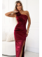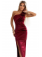 Satynowa długa suknia na jedno ramię ozdobiona pięknymi różami, które dodają kreacji wyjątkowego charakteru. Suknia posiada rozcięcie na nogę oraz drapowania w pasie i na biuście, które podkreślają sylwetkę i dodają elegancji. Wykonana z wysokiej jakości satynowego materiału w głębokim bordowym kolorze. Doskonała na uroczyste okazje. Produkt polski.