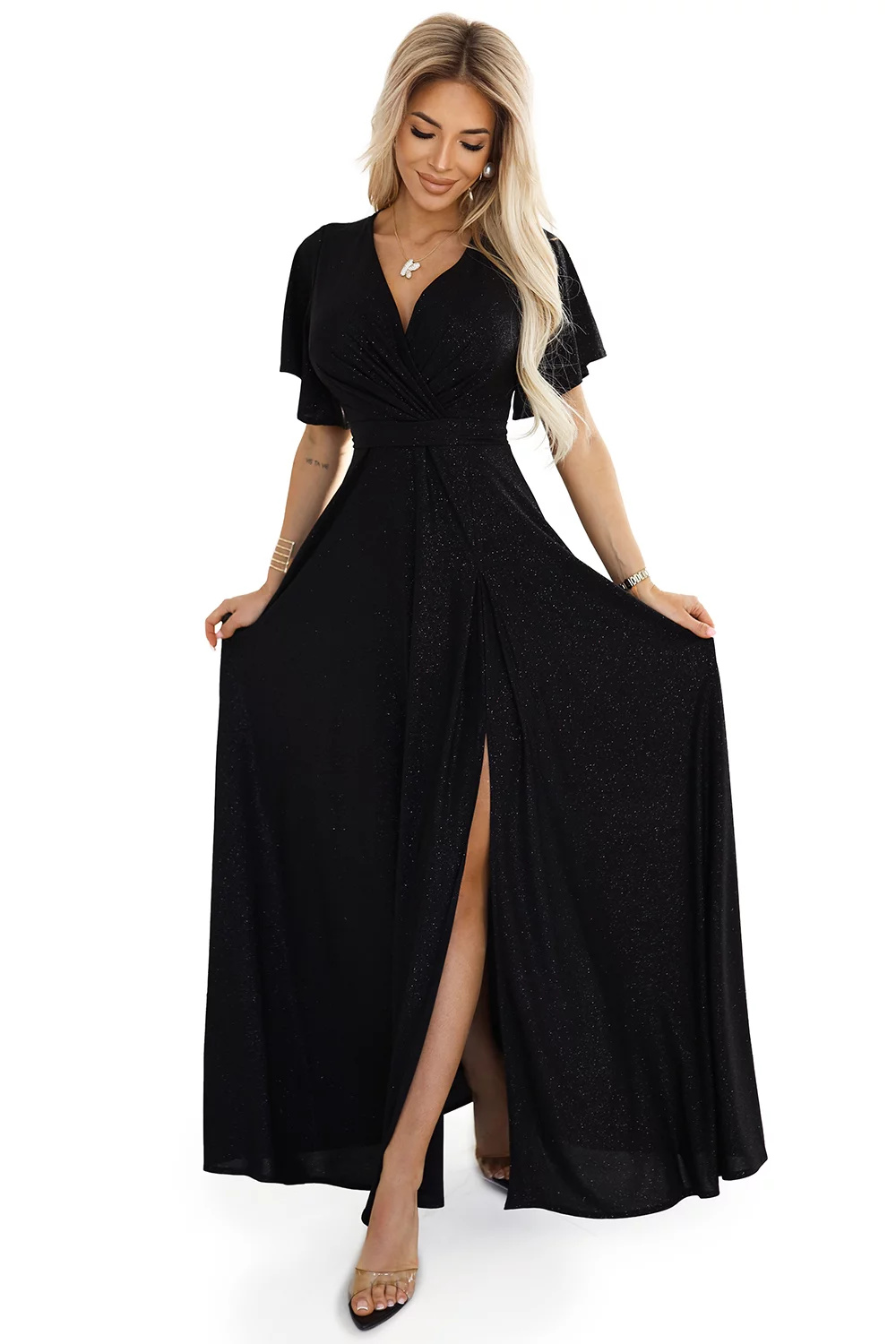 Dlouhé exkluzivní šaty s krátkým rukávem a výstřihem - černé s třpytkami
