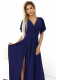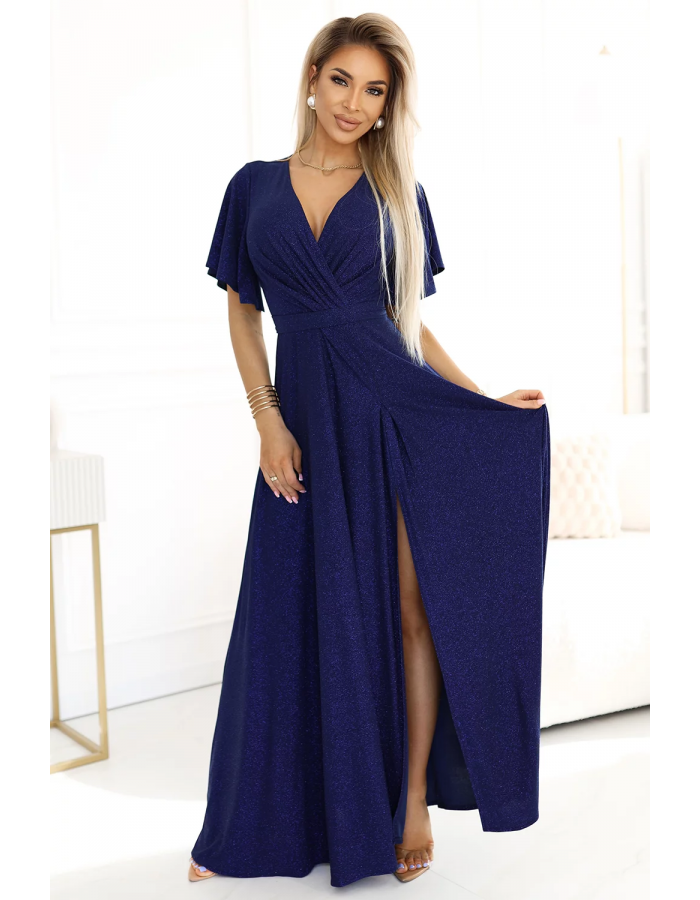 Šaty Jennifer Numoco – stylové dlouhé třpytivé šaty v hlubokém odstínu námořnické modré. Zavinovací výstřih, krátké rukávy a smyslný rozparek na noze dodávají eleganci a ženskost. Polská výroba, vynikající kvalita – ideální pro výjimečné příležitosti.