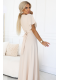 Elegantní béžové maxi šaty s výstřihem, vzdušnými rukávy a rozparkem na noze. Ideální pro výjimečné příležitosti. Polský produkt – značka Numoco.