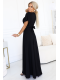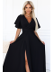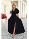 Černé dlouhé šaty s překládaným výstřihem, rozparkem na noze a krátkým rukávem. Elegantní, lehká a efektní – ideální na svatbu, maturitní ples a výjimečné příležitosti. Produkt polský. Značka Numoco.