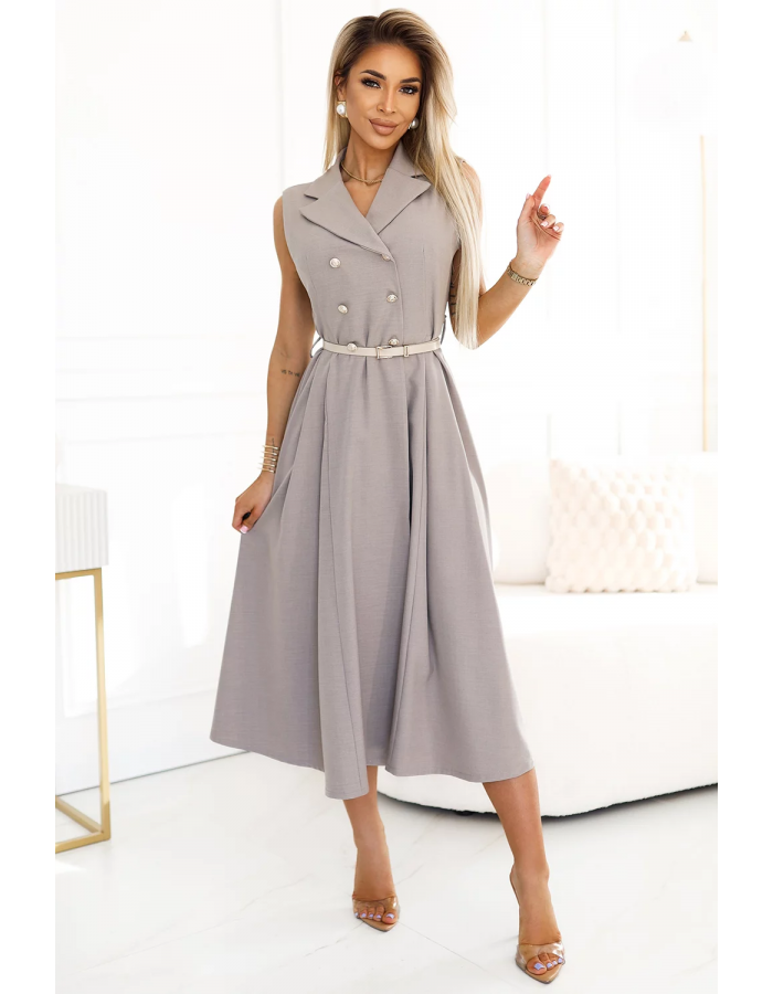 Midi košilové šaty šedobéžové | Numoco Basic – Elegantní košilové šaty s páskem, knoflíky a výstřihem do V. Stylová, pohodlná, ideální pro každou příležitost. Kup teď!