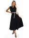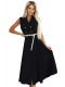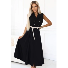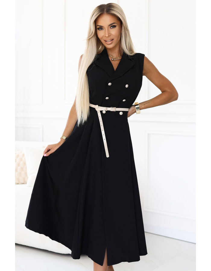 Stylowa czarna sukienka koszulowa bez rękawów z ozdobnymi guzikami i paskiem. Klasyczny krój w eleganckim wydaniu – idealna na co dzień i do pracy.