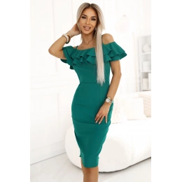Elegancka sukienka hiszpanka z falbankami na ramionach. Kolor zielony. Fason midi i mega kobiecy krój. Marka Numoco. Produkt polski. Idealna na wesele, randkę i uroczystości.