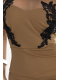 Elegantní dlouhé večerní šaty v barvě mocha mousse s přiléhavým střihem typu mořská panna, zdobené černou krajkou a síťovinou u výstřihu. Stylová nabídka značky Kocula na svatbu, galavečer nebo výjimečné události.