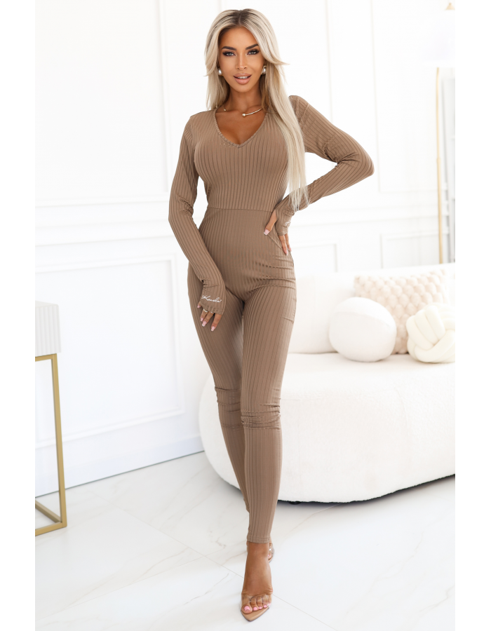 Dopasowany prążkowany kombinezon Kocula w kolorze mocha mousse z dekoltem V i długim rękawem. Elastyczny materiał podkreśla sylwetkę i zapewnia wygodę, idealny zarówno na co dzień, jak i na eleganckie wyjścia.