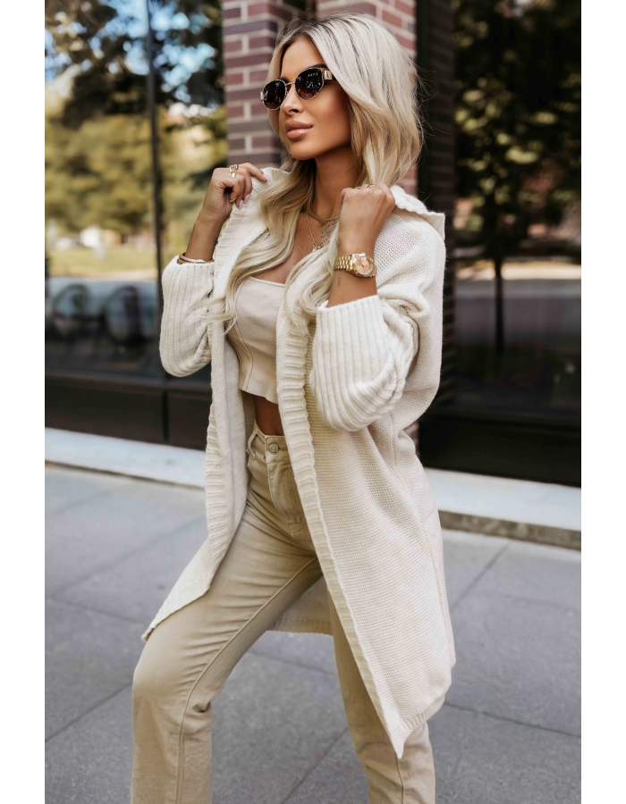 Stylowy kardigan damski marki Numoco Basic wykonany z miękkiej dzianiny w kolorze beżowym. Posiada praktyczny kaptur, wygodne kieszenie i modne ściągacze na rękawach – idealny na chłodniejsze dni. Produkt europejski.