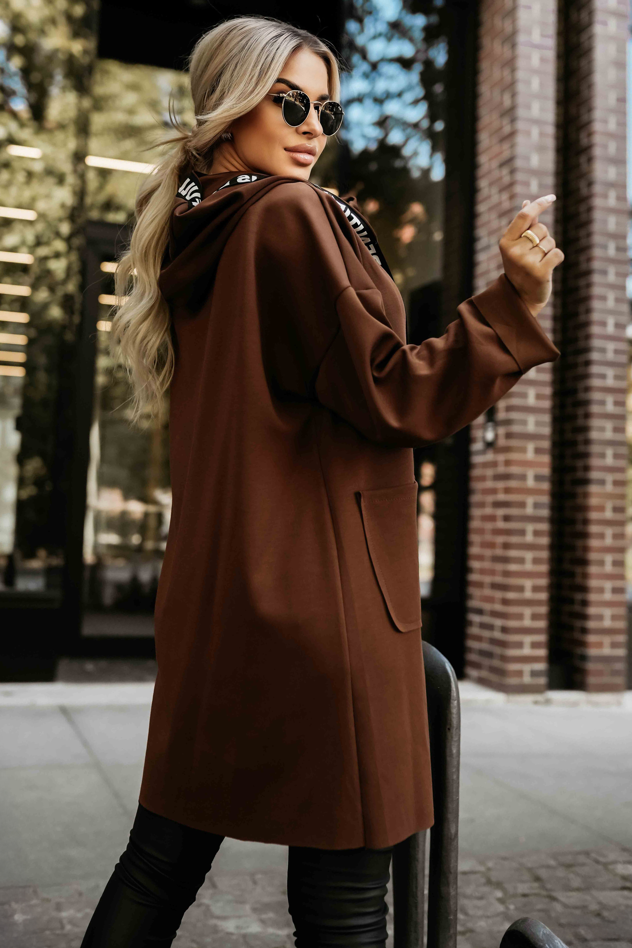 Stylowy płaszczyk damski marki Numoco Basic w kolorze czekoladowym. Wykonany z miękkiego, przyjemnego w dotyku materiału, idealny na chłodniejsze dni. Luźny fason z kapturem i praktycznymi kieszeniami zapewnia wygodę i modny wygląd. Produkt europejski.