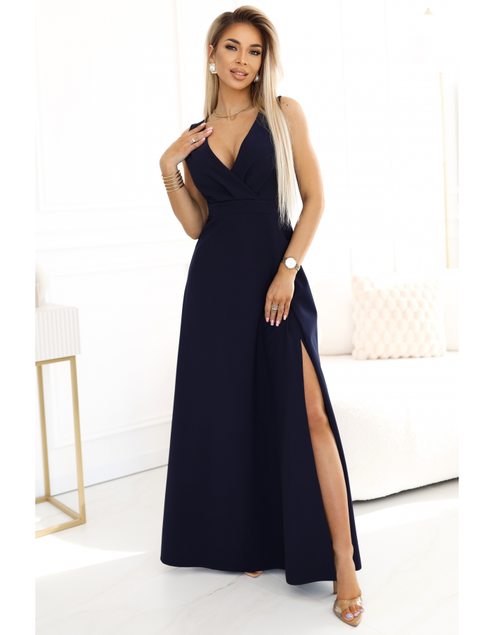 Elegancka granatowa sukienka maxi marki Numoco, wyprodukowana w Polsce. Posiada kopertowy dekolt, podkreśloną talię i rozcięcie na nodze - idealna na wesele, studniówkę czy Sylwestra.