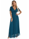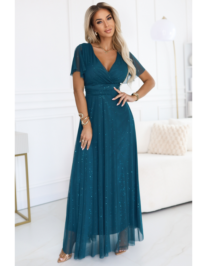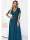 Elegantní dlouhé šaty MELANIA v barvě lahvově zelené, ušité z lesklého materiálu. Má výstřih ve tvaru písmene V, lehké rukávky a rozšířený spodní díl, který se krásně vlní při tanci. Značka Numoco Basic. Evropská produkce.