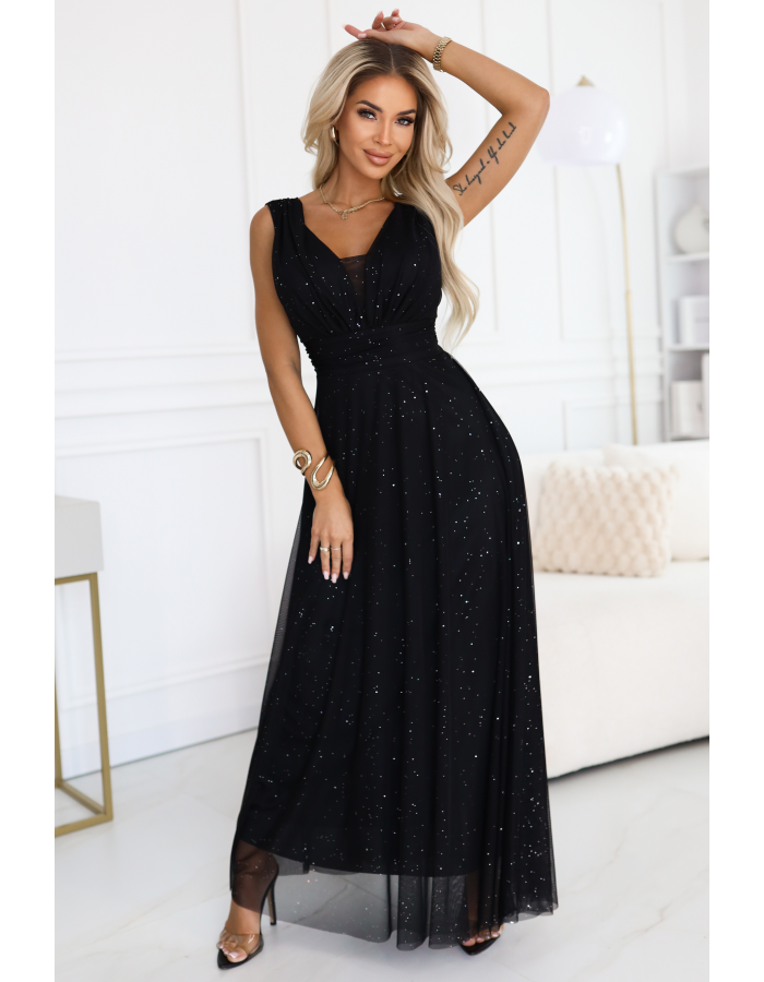 Elegantní dlouhé večerní šaty Numoco Basic s výstřihem do V a jemným leskem. Vyrobena z elastického černého materiálu, který krásně zdůrazňuje siluetu a zajišťuje pohodlí při nošení.
