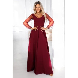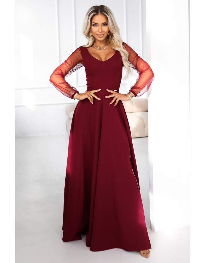 Elegancka bordowa suknia maxi z tiulowymi rękawkami - zmysłowa klasyka od Numoco