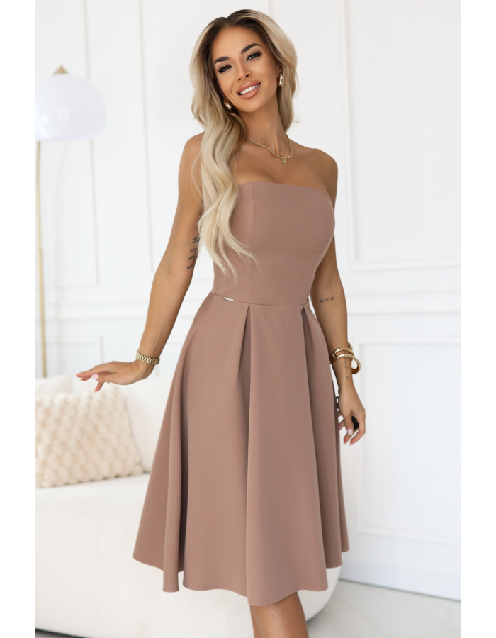 Elegancka beżowa sukienka Vivienne o długości midi zachwyca rozkloszowanym krojem, gorsetową górą i kobiecą linią. Idealna na wyjątkowe okazje - podkreśla figurę i dodaje klasy każdej stylizacji. Marka numoco. Produkcja polska.
