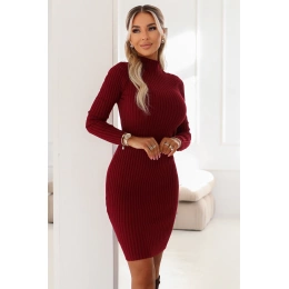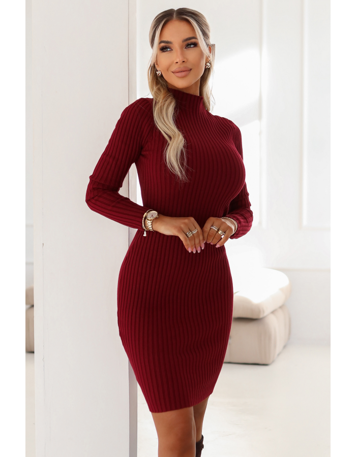 Bordowa sweterkowa sukienka z golfem marki Numoco Basic to dopasowany model z prążkowanej, elastycznej dzianiny, który podkreśla sylwetkę i zapewnia komfort na co dzień. Idealna na jesień, zimę, wiosnę - do pracy, na spotkania i codzienne stylizacje. Produkcja PRC.