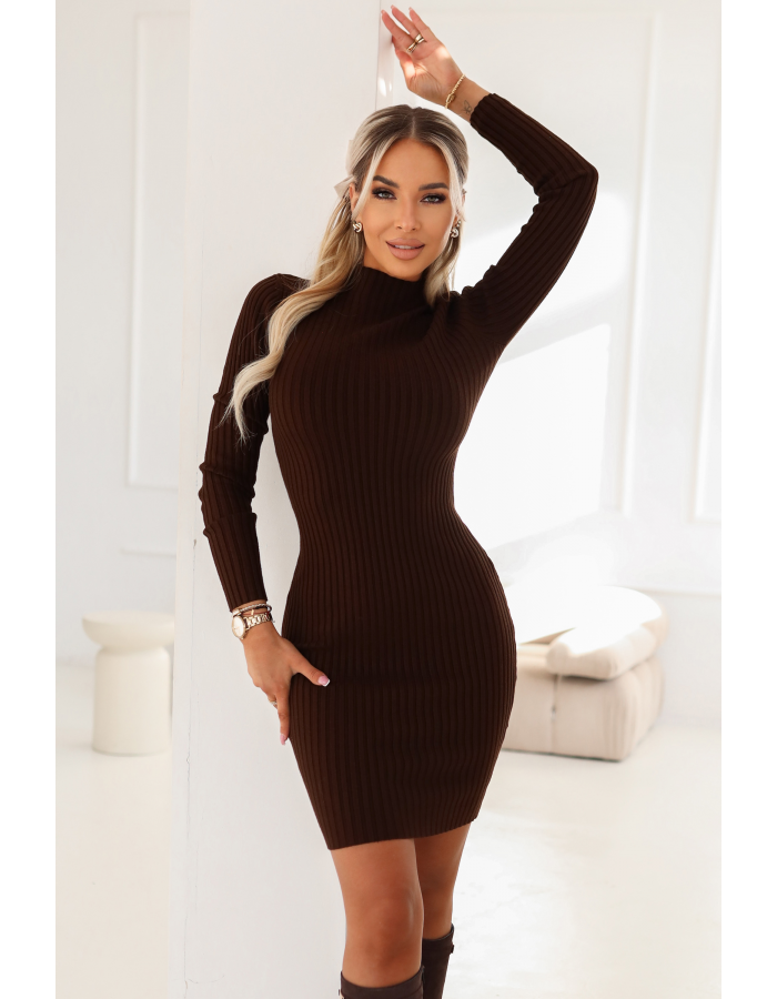 Czekoladowa sweterkowa sukienka z golfem marki Numoco Basic to dopasowany model z prążkowanej, elastycznej dzianiny, który podkreśla sylwetkę i zapewnia komfort na co dzień. Idealna na jesień i zimę – do pracy, na spotkania i codzienne stylizacje. Produkcja PRC.